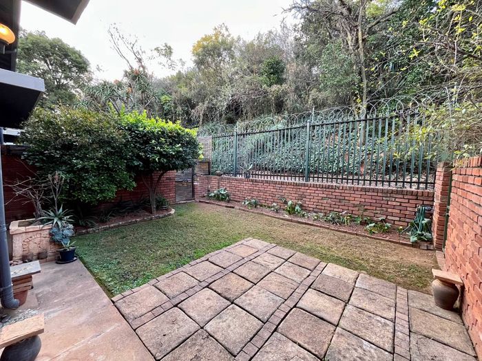 The open-plan dining and living area leads out to a covered patio with a built-in braai and louvre deck, overlooking a small garden.