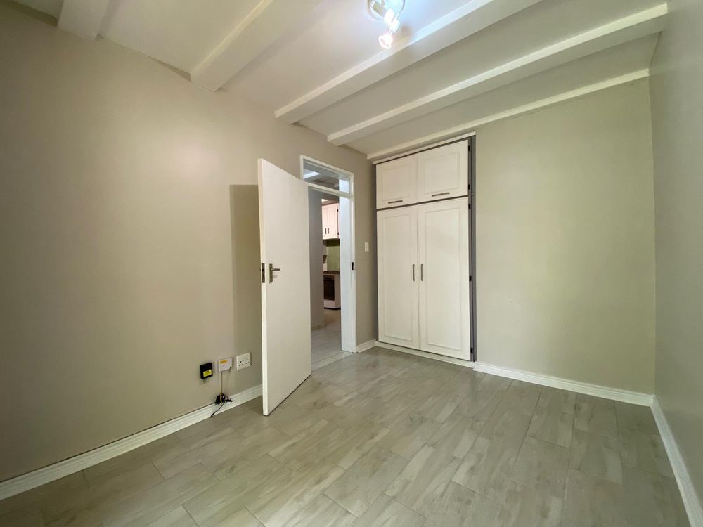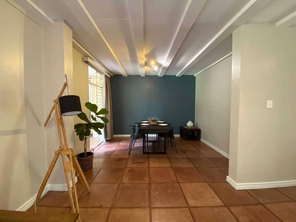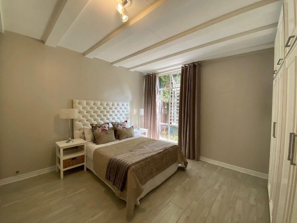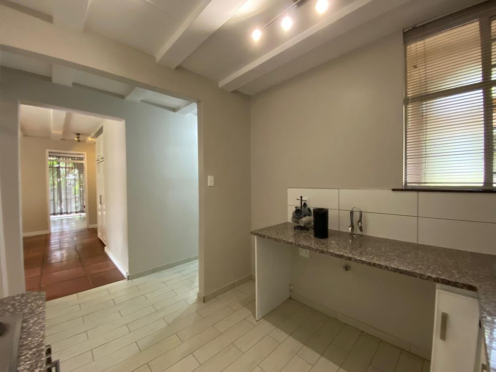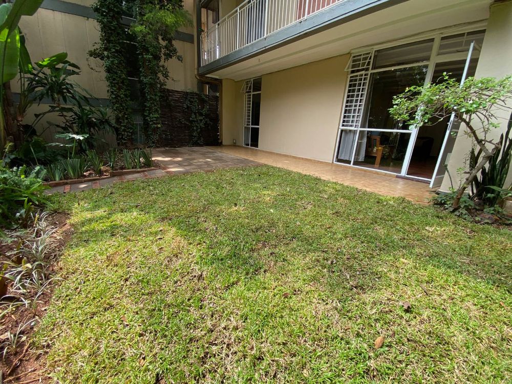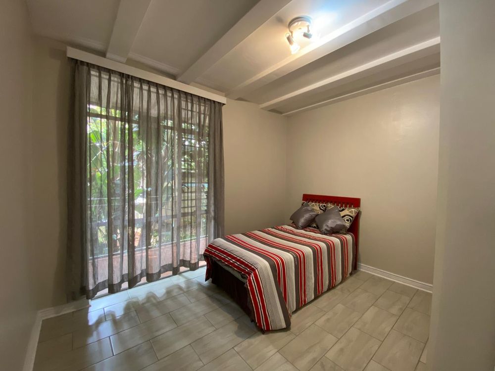 The unit features three large bedrooms, with the master bedroom boasting an impressive amount of cupboard space. The solid wood kitchen with granite countertops is both elegant and functional. The property includes a full bathroom with a large shower, as well as a second bathroom with a toilet and basin for added convenience. The spacious lounge and dining area flow seamlessly onto a patio shaded by mature trees, overlooking the lush greenery within the complex.