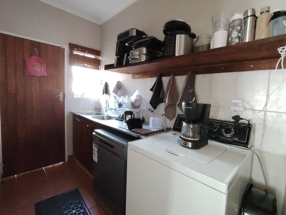 The kitchen with its dark stained Oakwood is open plan, with a separate scullery and space for 2 washing appliances, makes your daily tasks a breeze. The decent sized built-in pantry corner cupboard ensures enough space for groceries and extras. The kitchen also provides ample space for a double-door fridge and smaller box freezer.