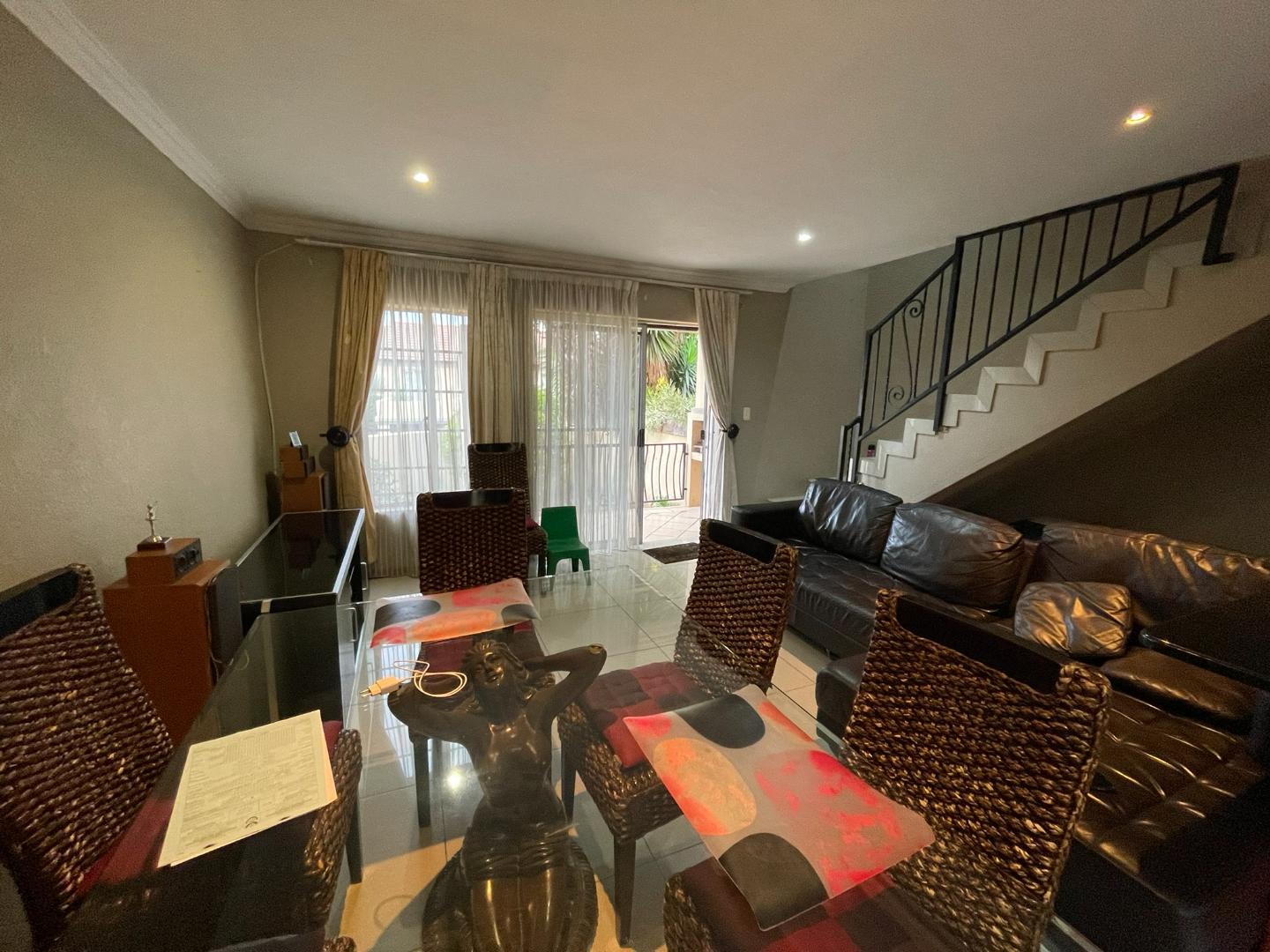 The open-plan dining and living area leads out to a covered patio with a built-in braai and louvre deck, overlooking a small garden.