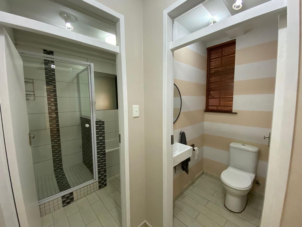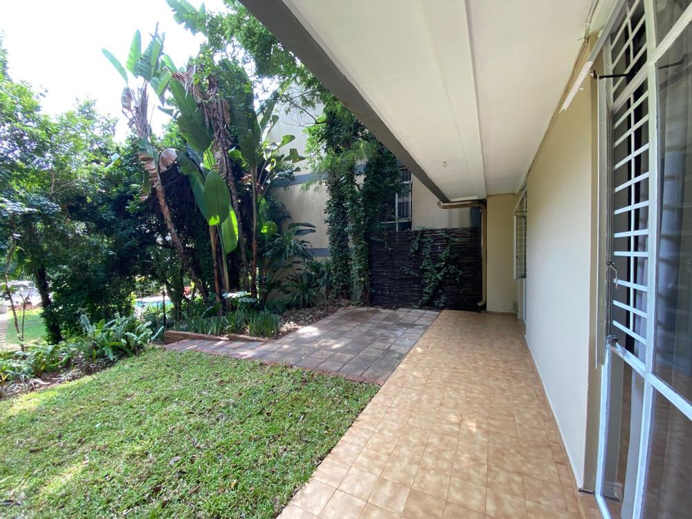 The unit features three large bedrooms, with the master bedroom boasting an impressive amount of cupboard space. The solid wood kitchen with granite countertops is both elegant and functional. The property includes a full bathroom with a large shower, as well as a second bathroom with a toilet and basin for added convenience. The spacious lounge and dining area flow seamlessly onto a patio shaded by mature trees, overlooking the lush greenery within the complex.