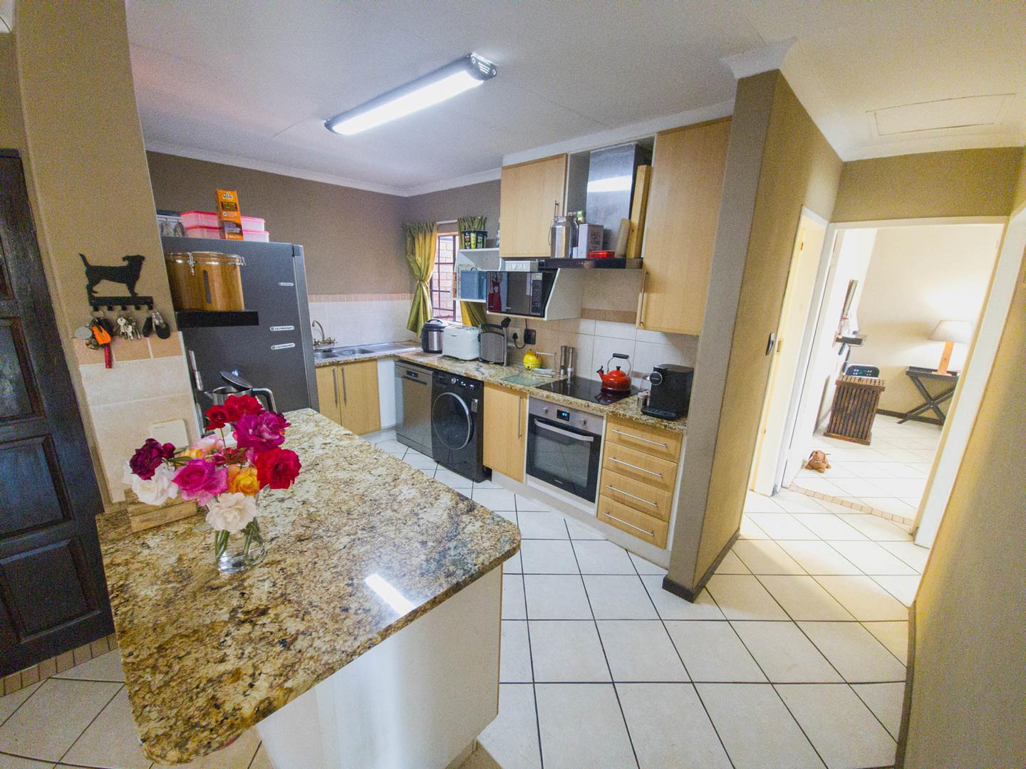 Welcome to easy living in Mooikloof Ridge — one of Pretoria's most established and sought-after estates. This immaculate 2-bedroom, 2-bathroom unit is fully tiled throughout and offers an open-plan kitchen and living area that opens directly onto a pristine, garden-level lawn maintained by the complex and fed by an in-ground irrigation system. The kitchen connects through to a spacious double garage, with an additional allocated parking bay at the front door. The main bedroom features an en-suite bathroom, while a second full bathroom serves guests. Security gates at both entrances, borehole water included in the levies, prepaid electricity through Impact meters, and 30Mbps Wi-Fi covered by the owner mean you move in and simply enjoy.