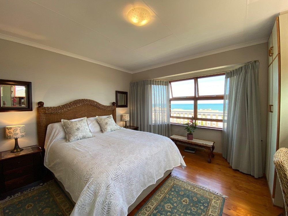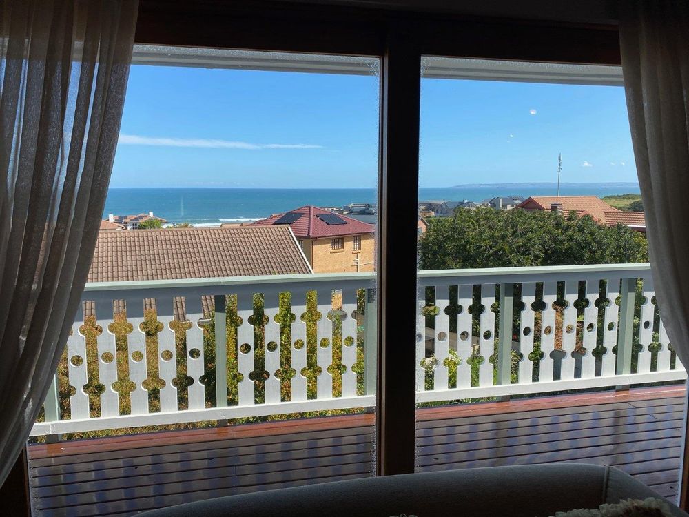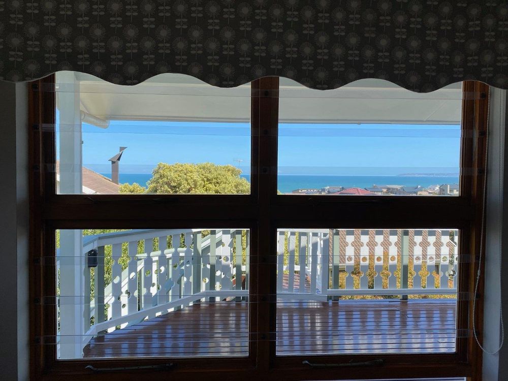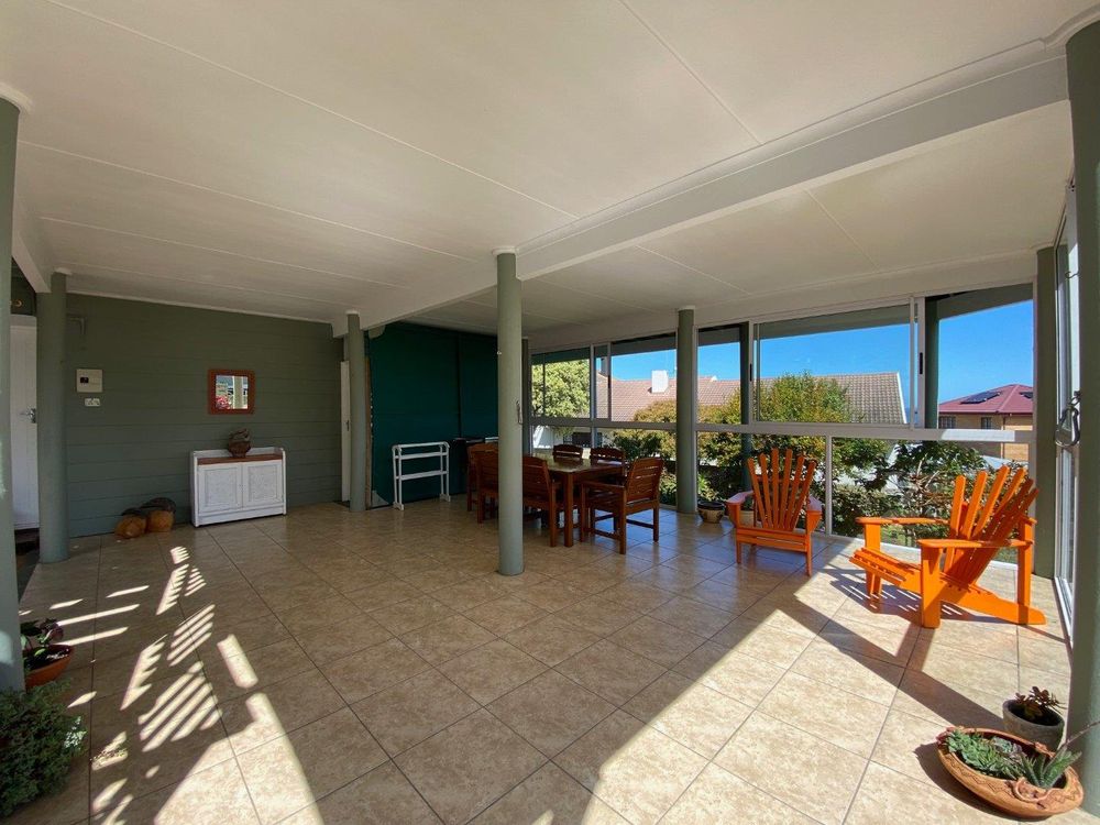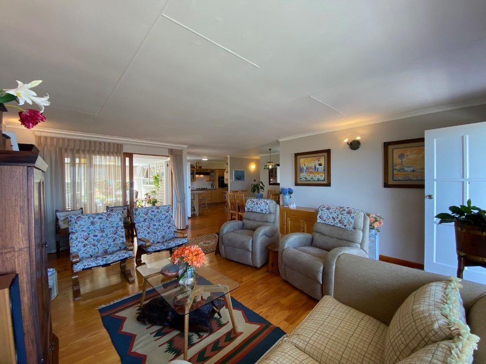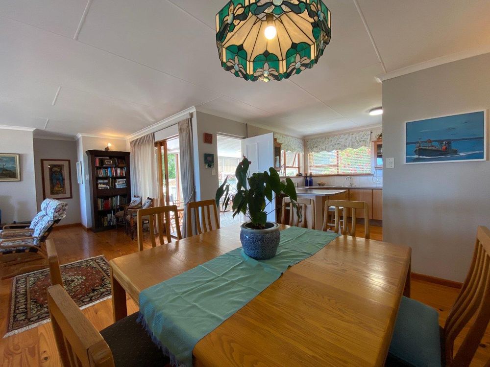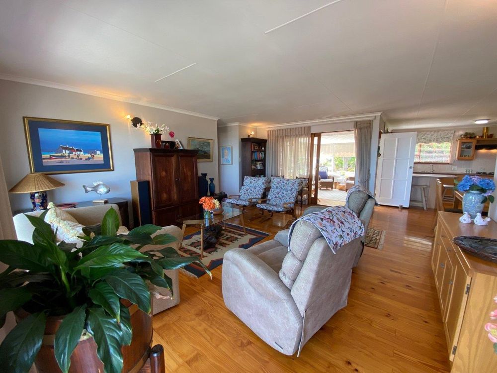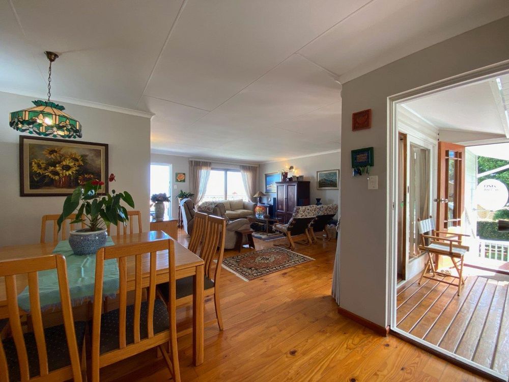 A lounge adjacent to the dining room, which opens onto a wooden deck with sweeping ocean views all the way to Mossel Bay