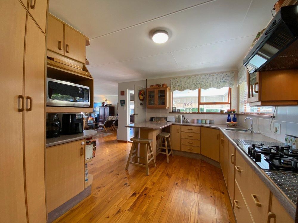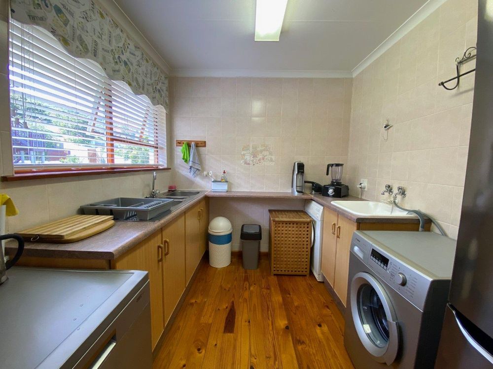 A large, well-equipped kitchen with ample cupboard space, a breakfast nook, and an open-plan laundry/scullery